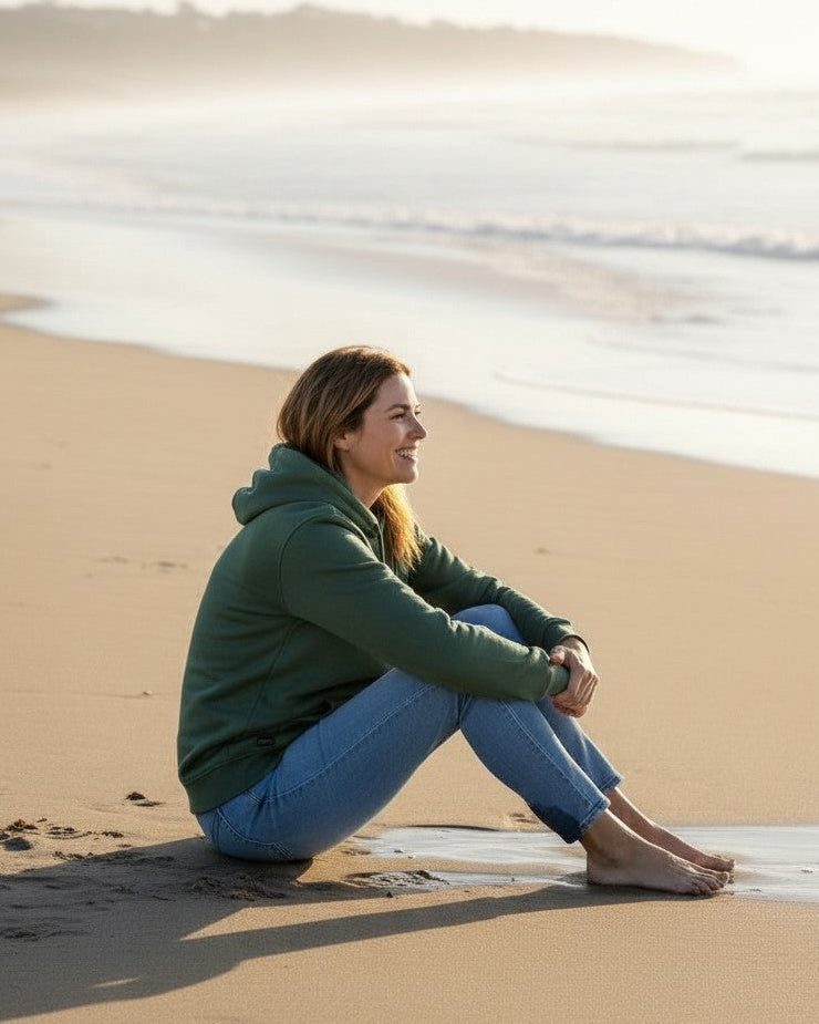 Lyft din stil med vår Icon Hoodie i en sofistikerad mörk grön nyans. Tillverkad av 100 % ekologisk bomull är denna huvtröja ett perfekt val för dig som värdesätter både komfort och ett medvetet hållbart mode.